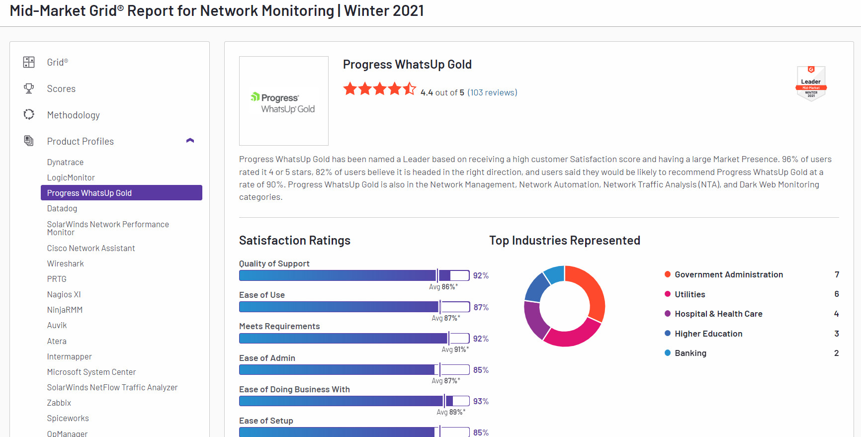 Sản phẩm được xếp hạng theo sự hài lòng của khách hàng (dựa trên đánh giá của người dùng) và sự hiện diện của thị trường (dựa trên thị phần, quy mô người bán và tác động xã hội). Giải pháp Progress WhatsUp Gold được đánh giá rất cao và nằm trong nhóm dẫn đầu các sản phẩm về giám sát mạng cho hệ thống. Điều này cho thấy sự tăng trưởng mạnh mẽ, được người dùng tin tưởng và đánh giá cao trong thực tế quá trình sử dụng sản phẩm.