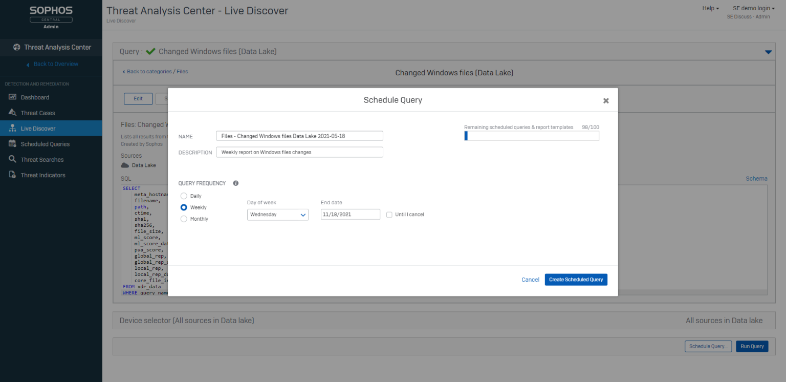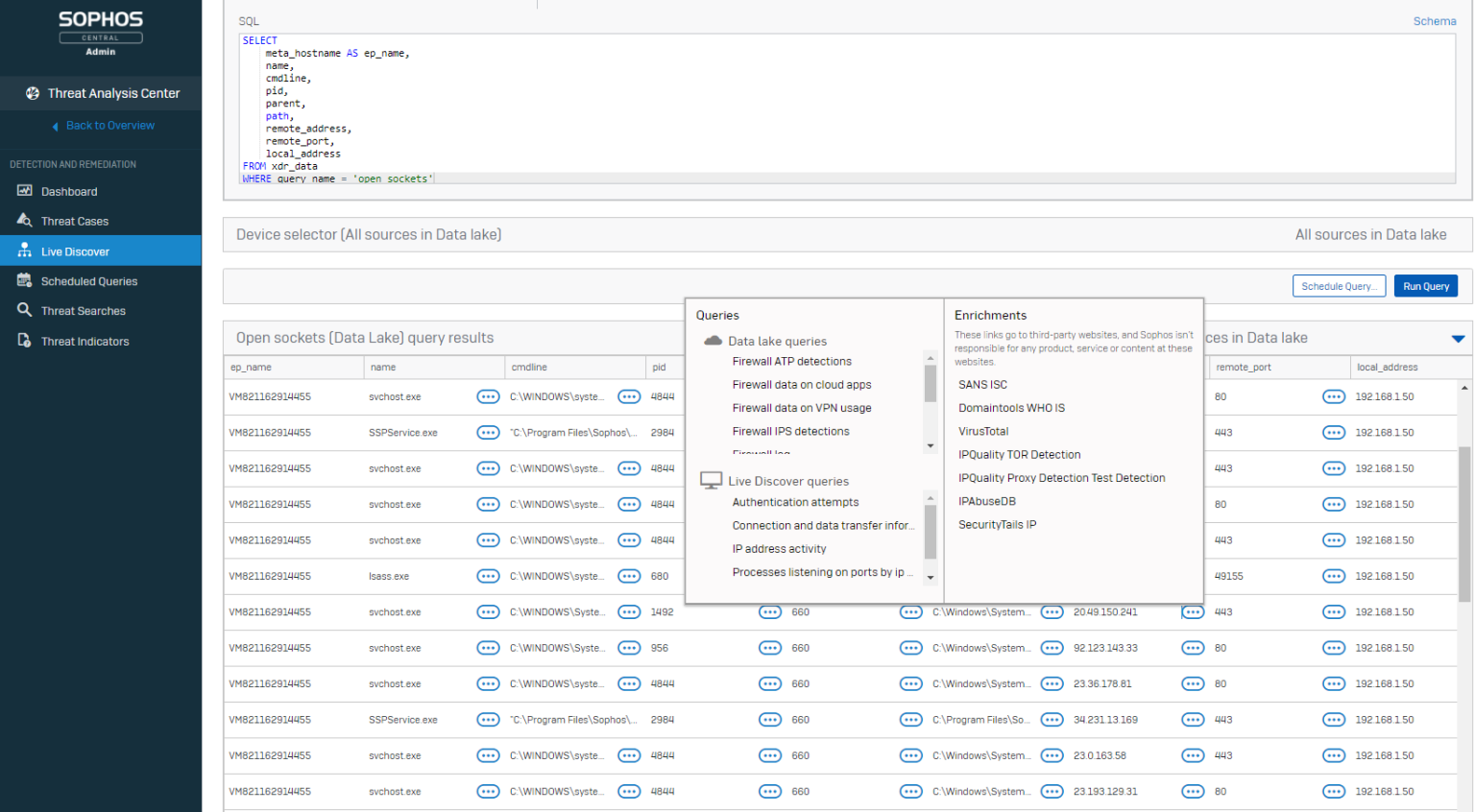 Sophos Data Lake cũng cho phép quét các sự kiện có quy mô rộng hơn, ví dụ như có thể xác định một tài khoản đáng ngờ đăng nhập trên nhiều thiết bị. Sau đó có thể xác định, truy vấn thiết bị bằng Live Discover để nhận nguồn dữ liệu trực tiếp các máy cần phân tích. Qua đó nhanh chóng xác định và ngăn chặn các hành vi đáng ngờ.